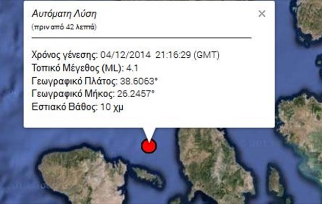 Σύμφωνα με το Γεωδυναμικό Ινστιτούτο, το επίκεντρο του σεισμού βρίσκεται στη θαλάσσια περιοχή 15 χιλιόμετρα βόρεια της Χίου.